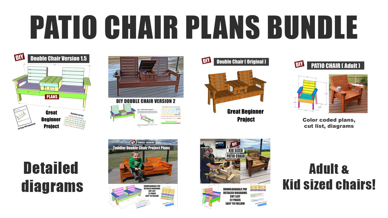 Available for a limited time only! All 6 patio chair plans. A $60 value! Plus, free Youtube tutorials available to help with your project build! 1. New Double Chair Version 1.5 ( Wider Seats ) 2. Double Chair with Storage 3. DIY Patio Chair 4. DIY Double Chair for Toddlers 5. DIY Kid's Patio Chair 6. The original version of the double chair ( Go with the version 1.5 if you want a little more roomy design )