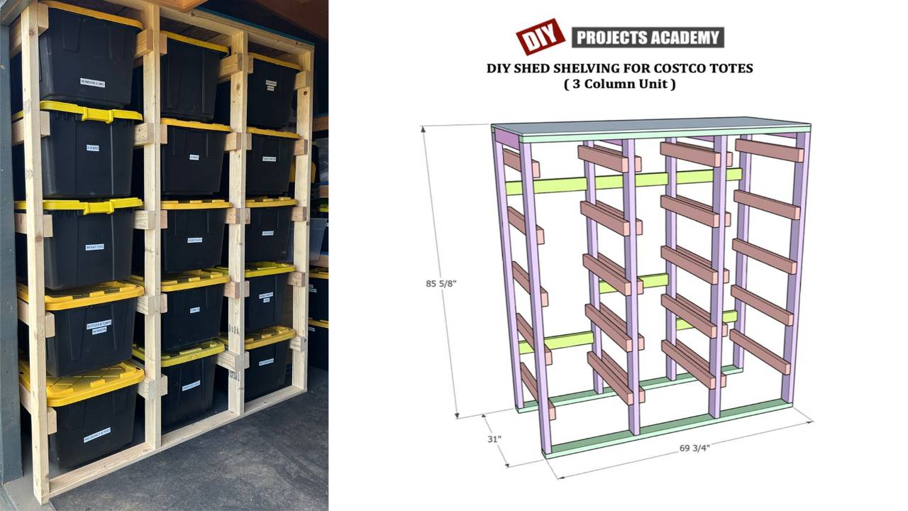 Detailed diagrams and constructions to build your own storage shelves for 27 gallon Costco totes!!